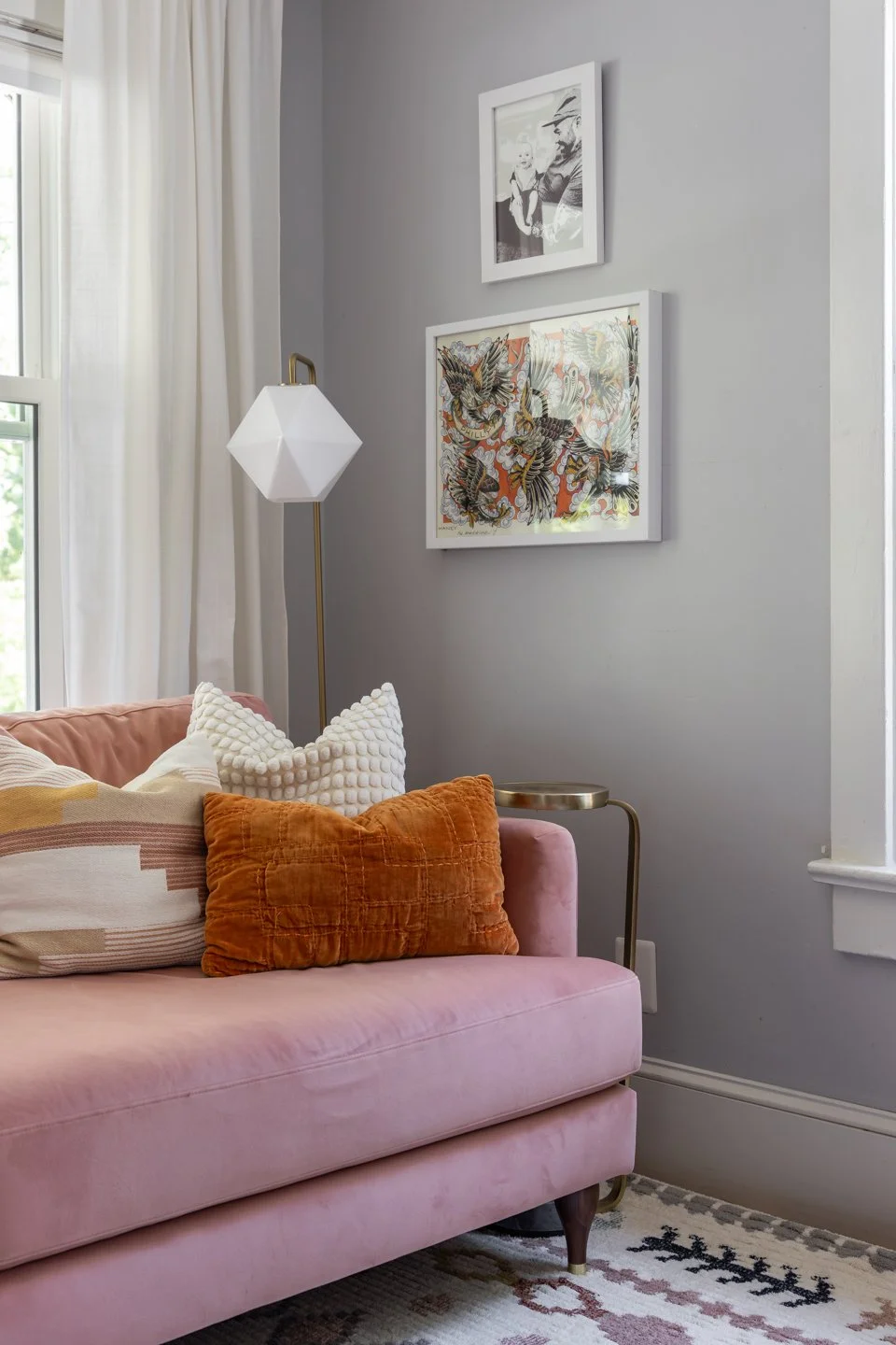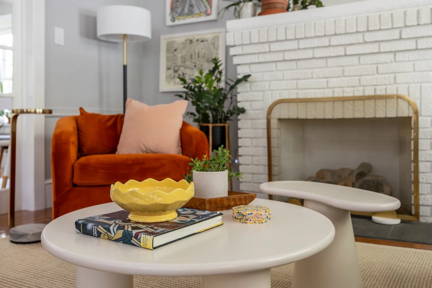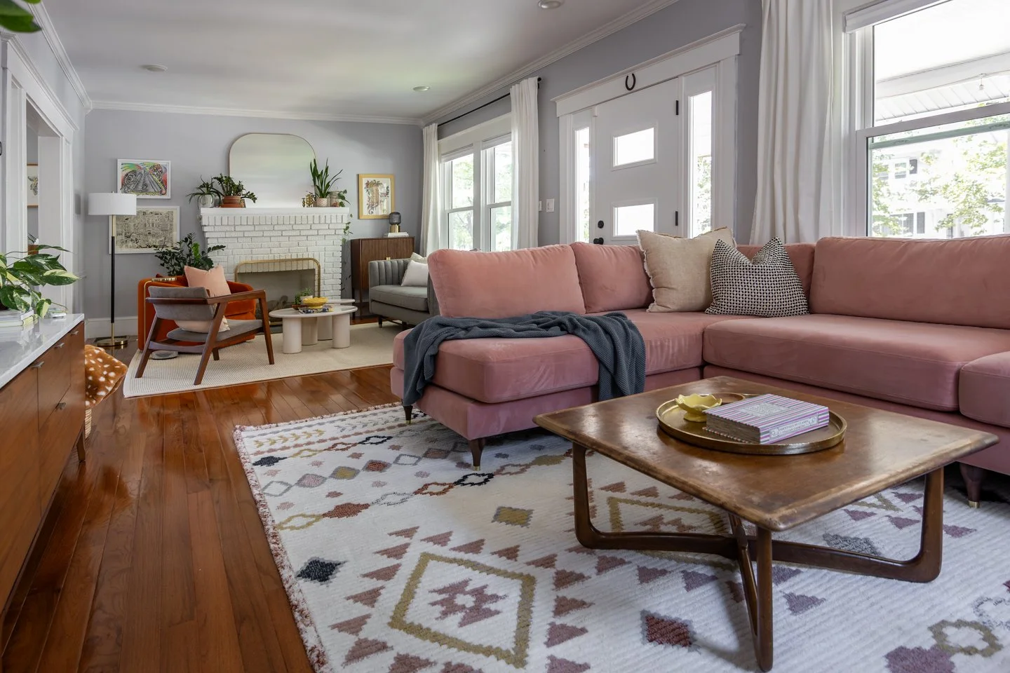 We created mood boards, a new room layout, and selected new furniture and decor. Re-arranging the art and some existing decor made the space feel playful and personal. We also incorporated some items they wanted to keep, including a beloved family heirloom. This living room has new life to it and plays up the mid-century, southwestern, and colorful vibes that they love.